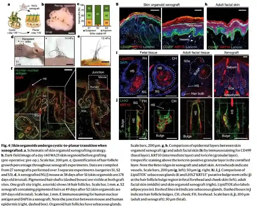 他们利用人类多能干细胞培养的皮肤类器官在培养4-5个月后,形成了多层皮肤组织,包含毛囊、皮脂腺和神经回路。将其移植到免疫功能不全的小鼠的背上皮肤后,55%的移植物上都长出了2-5毫米的毛发。这表明,该类器官能够与小鼠表皮融合,形成含人类毛发的皮肤。