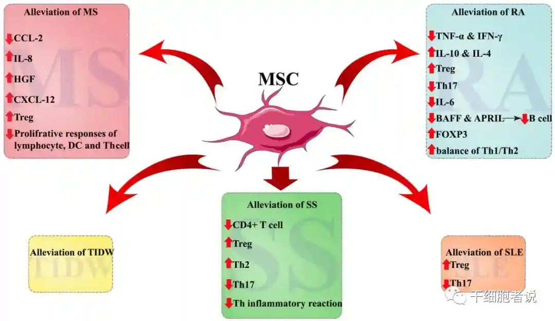 图3.间充质干细胞在自身免疫性疾病中的临床应用
