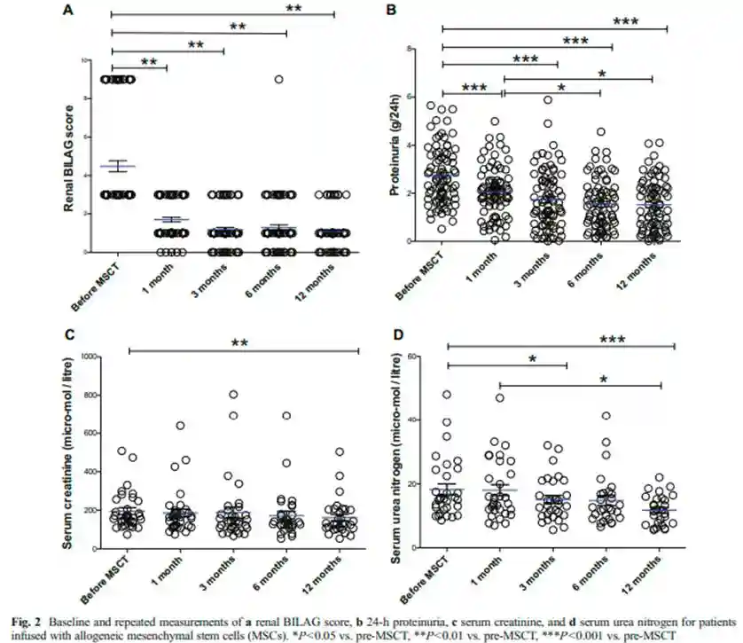 目前全球已经有1500多例SLE患者接受了MSCs治疗,其中大部分患者接受的是异体MSCs移植。疗效方面,异体MSCs治疗1年后60.5%的患者获得完全缓解,尿蛋白(24h)、不列颠群岛狼疮评估组评分(BILAG)明显下降;治疗4年后50%的患者仍获得临床缓解,4年生存率为94%,总复发率仅为23%。此外,对于重症难治性SLE,有效率达60%,使重症难治性SLE患者5年病死率从原来的35%-45%下降至16%。