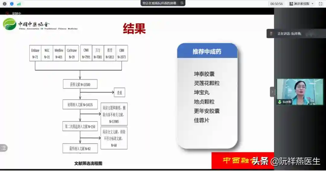 首都医科大学附属北京妇产医院阮祥燕教授为大家带来了题为《中成药治疗更年期综合征临床应用指南及解读(2020年版)》的精彩讲座。阮教授首先简单介绍了指南临床问题的构建、药物遴选、文献检索、纳入标准、排除标准等。详细讲解了坤泰胶囊等治疗更年期综合征的有效性、安全性。坤泰胶囊联合激素类药物有协同作用,建议用于更年期综合征属于中-重度患者。随后又补充了《围绝经期和绝经后妇女骨质疏松防治专家共识》,指出骨疏康等中药对骨质疏松症治疗的有效性。