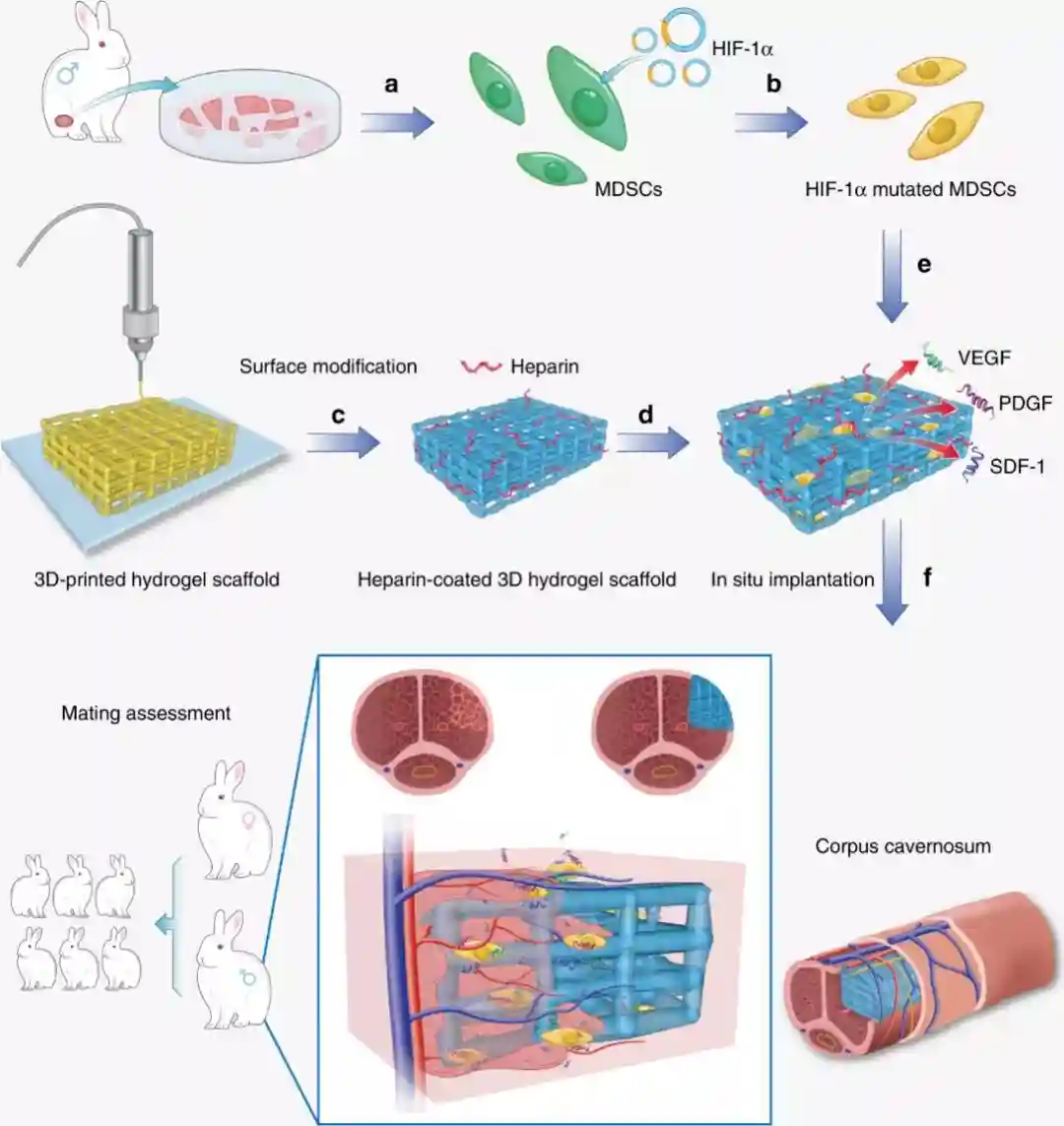 为此,研究人员利用干细胞技术,向其中植入了高表达缺氧诱导因子(HIF-1α)的肌源性干细胞(MDSCs),还通过肝素与聚L-赖氨酸(PLL)的逐层组装,将肝素沉积到3D打印的水凝胶支架上,刺激植入部位血管形成,制备出生物工程血管化阴茎海绵体。
