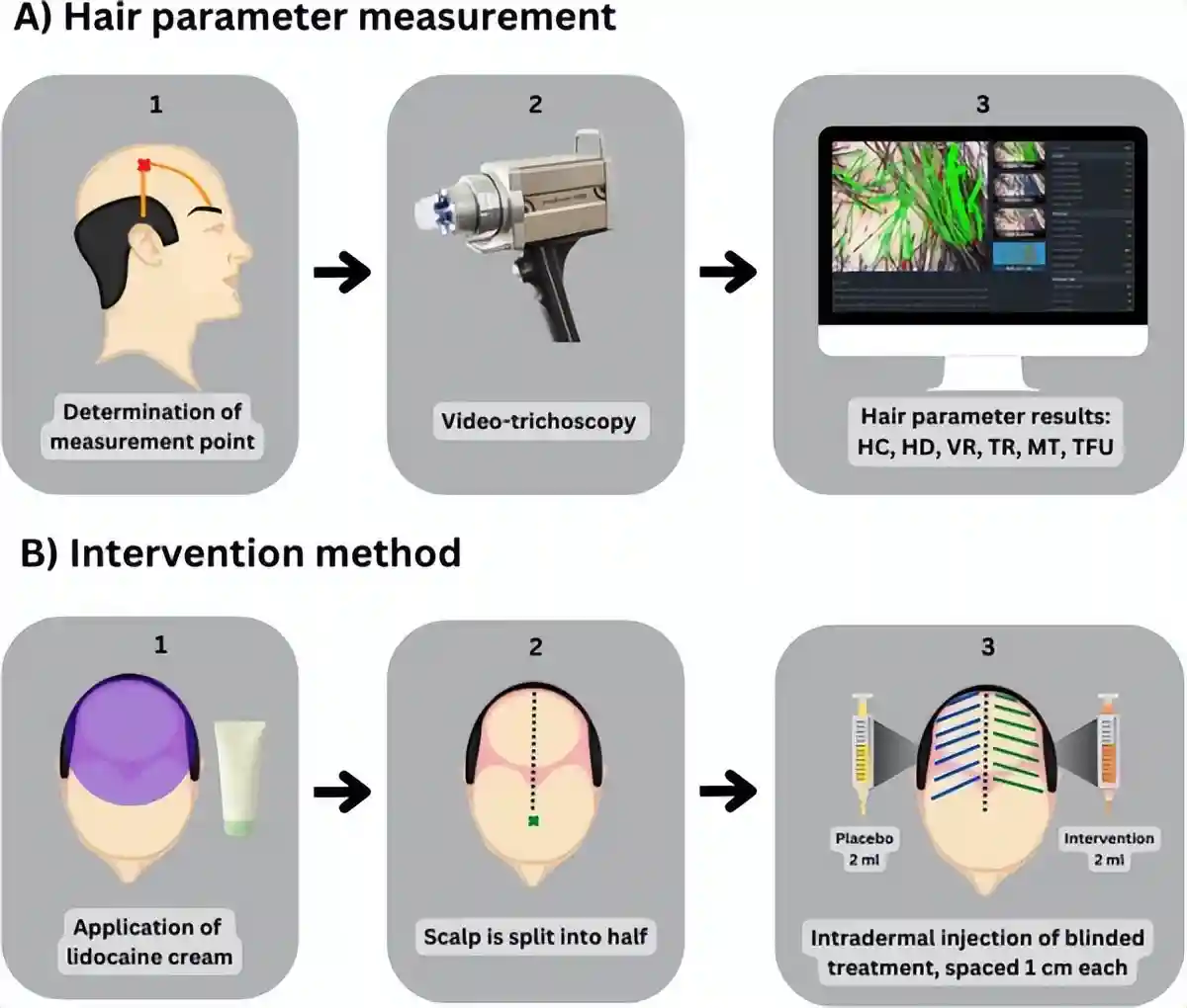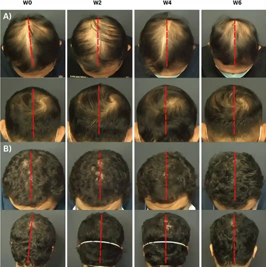 研究者将患者头部划分为左右两区域,一侧注射2mlADSC-CM,另一侧注射2ml氯化钠作为安慰剂。注射完成后,每天使用2次5%浓度米诺地尔。