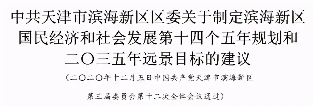 “十四五”时期是滨海新区在全面建成高质量小康社会基础上,加快推进新时代高质量发展,落实“双城”发展布局,推进“二次创业”,全面建设生态、智慧、港产城融合的宜居宜业美丽滨海新城的关键时期。中共天津市滨海新区第三届委员会第十二次全体会议,认真学习贯彻党的十九届五中全会和市委十一届九次全会精神,结合自身实际,就制定滨海新区国民经济和社会发展第十四个五年规划和二〇三五年远景目标提出以下建议。