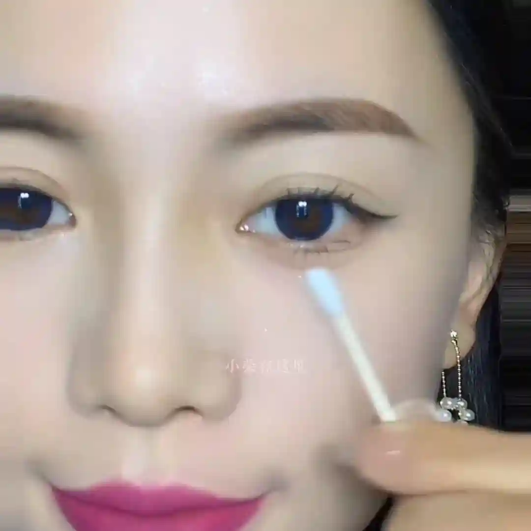 眼睛挤一下,在壳这个位置轻轻勾一条淡淡的阴影,然后马上用棉签把阴影给它晕的淡一些,这样就可以画出一个非常自然的卧蚕效果。