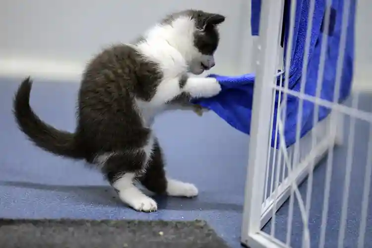“大蒜”很活泼,正在扑抓一块布。
