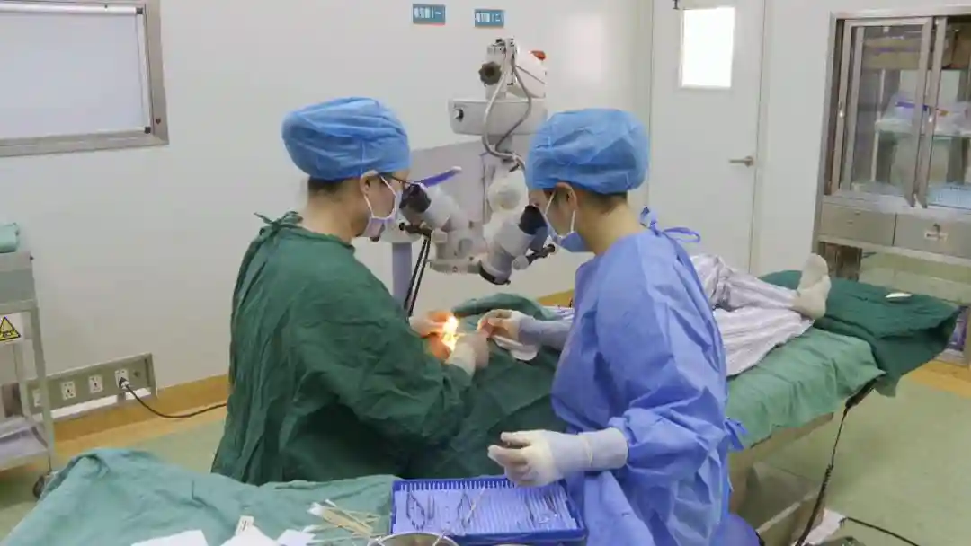 上午十点半,绥江县人民医院麻醉科正在实施一例翼状胬肉切除术,主刀医生是上海市第五人民医院眼科专家金轶平。眼部麻醉、撑开眼睑、胬肉分离切除、角膜缘干细胞移植、缝合伤口,约20分钟,手术顺利完成,精湛娴熟的技术、体贴入温的关怀让患者倍感温暖。
