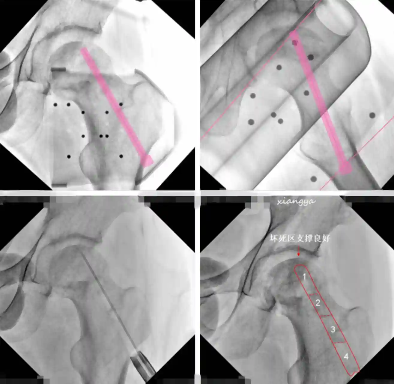 上图:术中机器人定位,导针指向股骨头坏死区;左下:术中按机器人定位隧道,指向股骨头坏死区注入自体PRP;右下:4根髂骨棒植入后,股骨头坏死区支撑良好