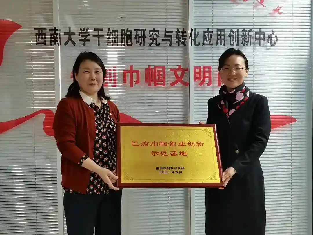 ▲北碚区妇联党组书记、主席肖竞秋(右)为西南大学干细胞研究与转化应用创新中心授牌
