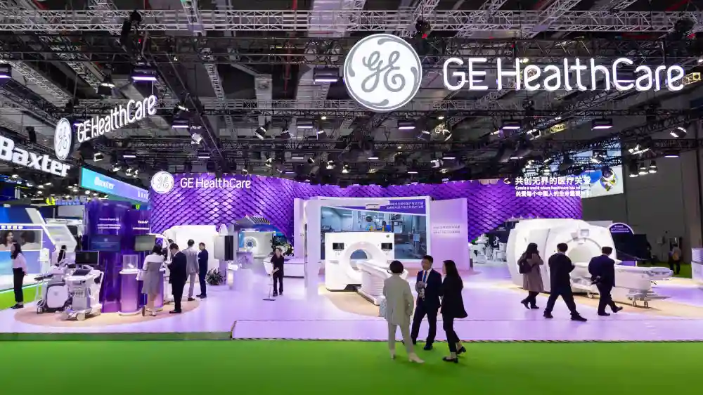 2023年11月8日在第六届中国国际进口博览会医疗器械及医药保健展区拍摄的GE医疗展位。新华社记者王翔摄