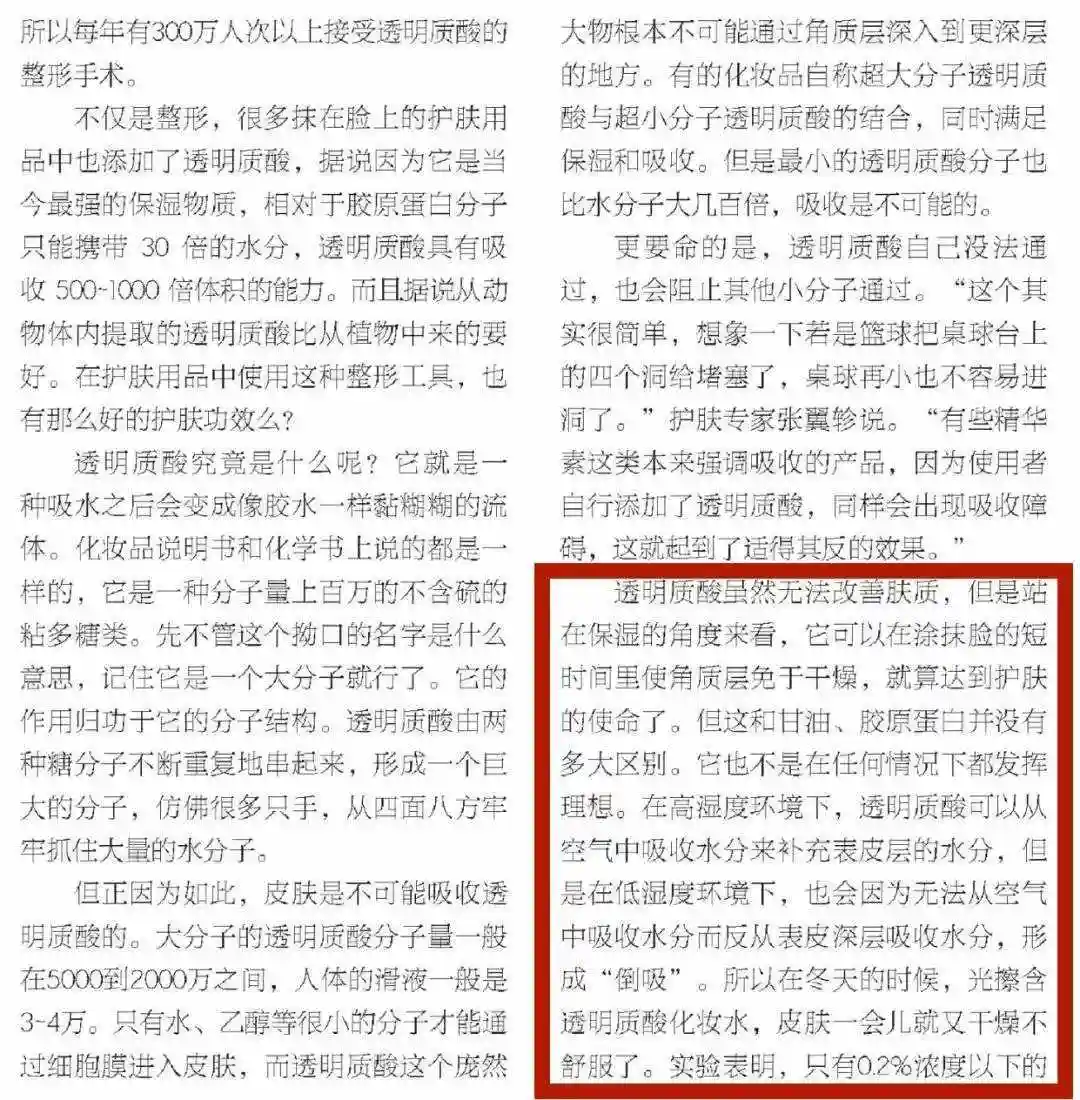 早在2009年,桂祺莹和郝鹏飞所著论文《可疑的玻尿酸》一文中,就强调了玻尿酸为大分子结构,无法被皮肤所吸收。而且玻尿酸存在“倒吸”特性,冬季甚至可能让皮肤变得更加干燥。