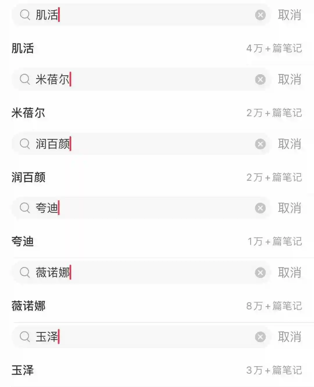 即便是米蓓尔和肌活这两大核心产品,在功能性护肤品赛道内,仍被各自的竞争对手狠狠压制。在小红书上,肌活和米蓓尔的相关笔记数分别为4万和2万,而和两者定位高度一致的薇诺娜和玉泽,相关笔记数分别为8万和3万。即便是主打玻尿酸精华护肤两大王牌润百颜和夸迪,笔记数也仅有2万和1万。