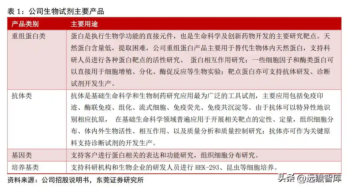 公司是国产生物试剂龙头。公司成立于2007年,是一家从事生物试剂研发、生产、销售并提供技术服务的生物科技公司,主要向客户提供包括重组蛋白、抗体、基因和培养基等产品,以及重组蛋白、抗体的开发和生物分析检测等服务,同时也为制药公司或者生物技术公司提供单克隆抗体候选药物的临床前规模生产服务。