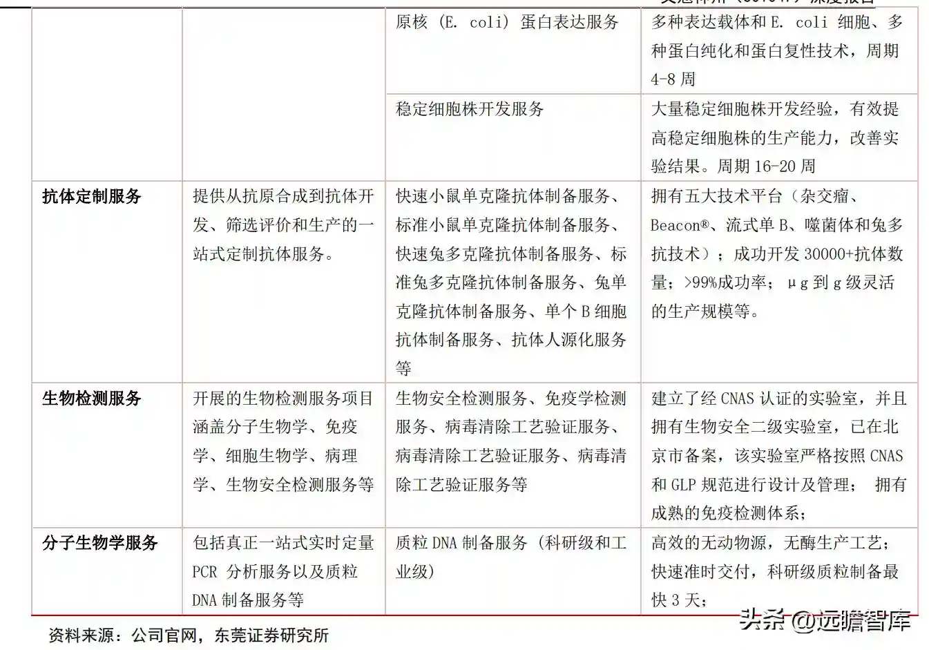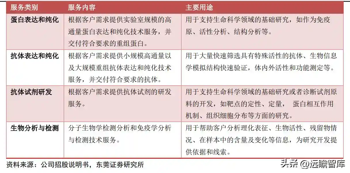 公司拥有每年研发生产1000+种蛋白和开发1000+种抗体的能力,能向客户提供高质量的“一站式”技术服务,主要包括蛋白表达和纯化服务、抗体表达和纯化服务、单克隆抗体制备服务(杂交瘤技术、噬菌体展示技术、单B细胞)、抗体工程(人源化、稳定细胞系建立、杂交瘤细胞测序)和生物检测服务(体外药效评价、免疫学检测、生物安全检测)等。
