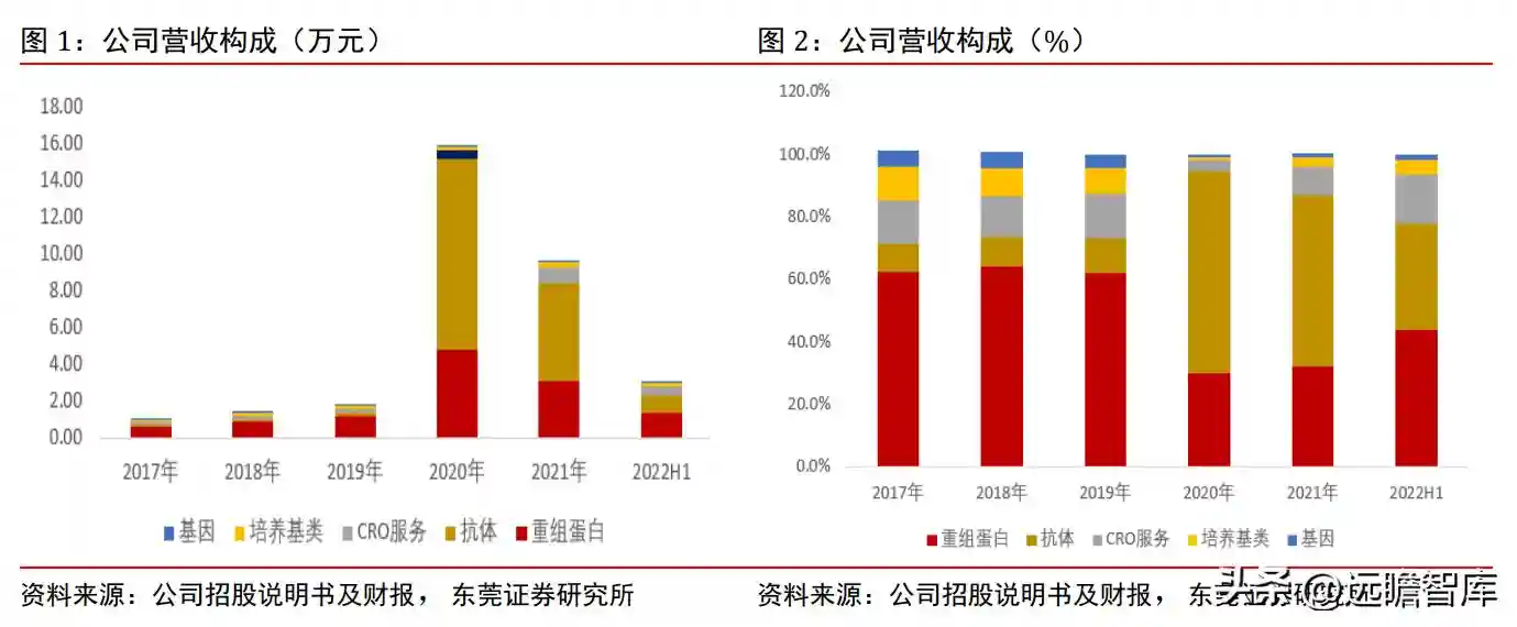 重组蛋白和抗体为公司贡献了主要收入。公司收入主要来自重组蛋白、抗体、CRO服务、培养基类和基因。