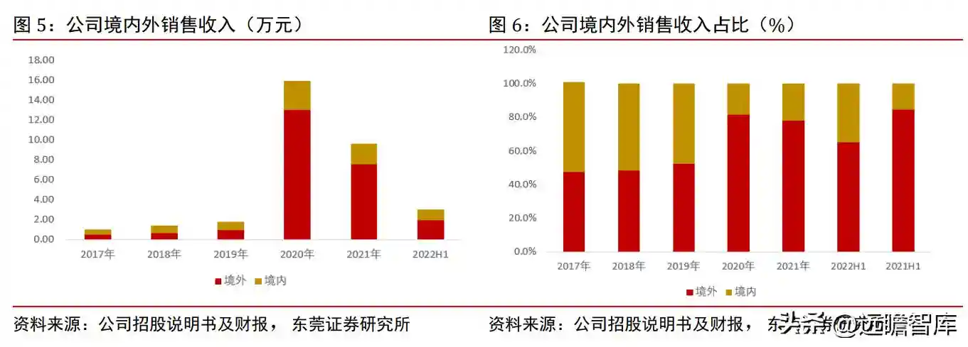 2021-2022H1,随着新冠病毒相关产品收入占比的回落,境外收入占比随之回落至64.9%,境内收入占比回升至35.1%。