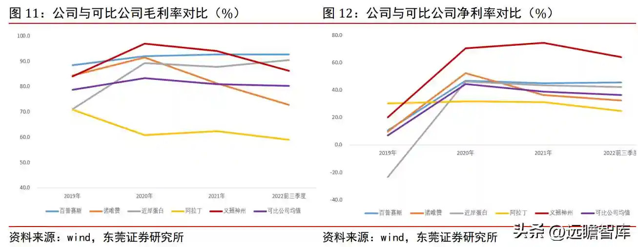 我们选取百普赛斯、诺唯赞、近案蛋白和阿拉丁作为可比公司。2019-2022前三季度,公司毛利率分别为84%、96.9%、94%和86.1%,可比公司毛利率均值分别为78.6%、83.3%、80.9%和78.7%;公司净利率分别为20.1%、70.6%、74.6%和64.1%,可比公司净利率均值分别为6.8%、44.4%、39%、36.4%。