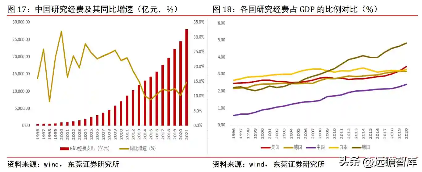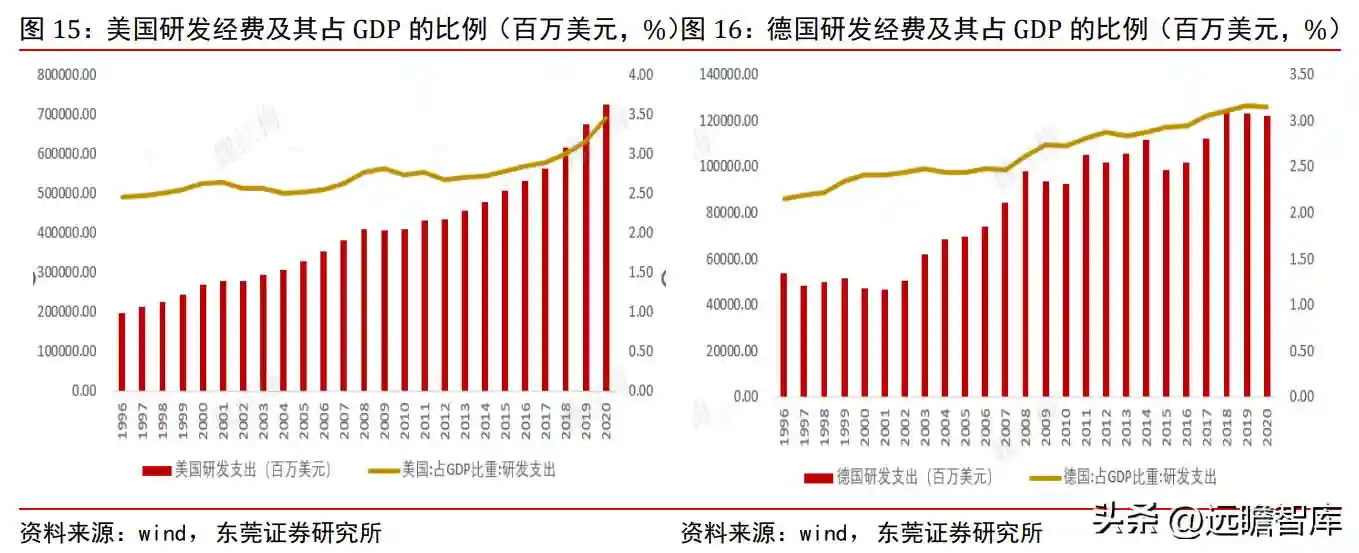 根据世界银行的统计数据,美国、德国2000-2020年研究经费占GDP的比重分别提升了0.82个百分点和0.73个百分点,研究经费投入年均复合增速分别为5.1%和4.9%。
