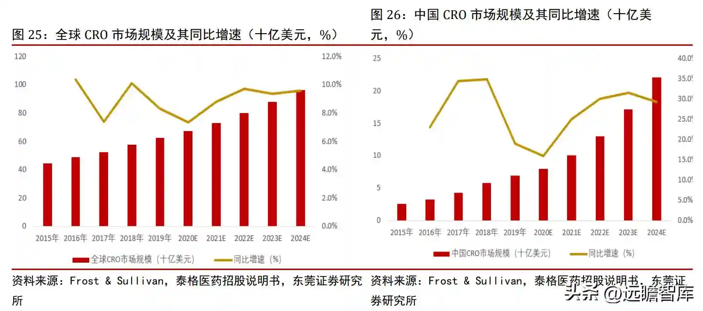 根据弗若斯特沙利文,全球CRO市场规模从2015年的443亿美元增长至2019年是626亿美元,CAGR为9.0%,预计到2024年有望达到960亿美元,CAGR为8.9%。