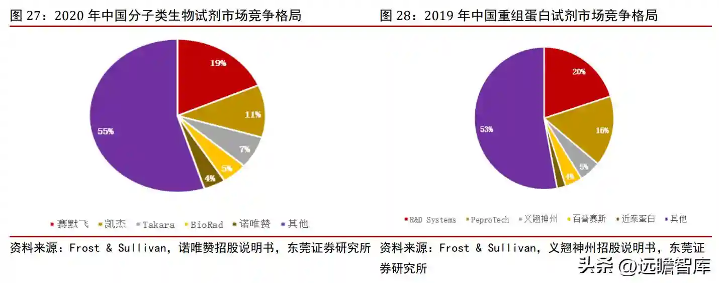其中市场规模占比超过50%的分子类生物科研试剂,根据FrostSullivan数据,2020年,中国分子类生物科研试剂市场CR5约为45%,其中外资厂商赛默飞、凯杰、Takara、BioRad市场占有率分别为19%、11%、7%和5%,合计占据超过40%的国内市场份额;国产厂商中,诺唯赞市场占有率最高,但仅为4%。