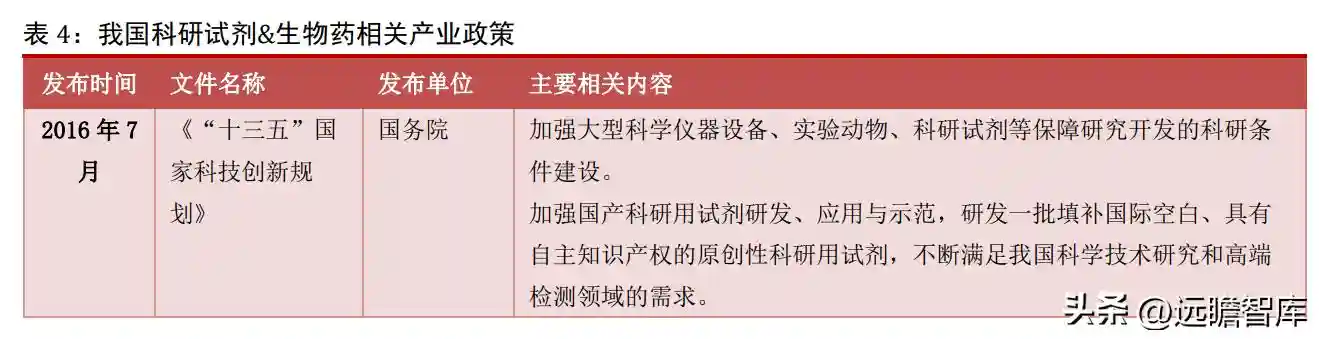 《“十三五”国家科技创新规划》和《“十三五”国家科技创新基地与条件保障能力建设专项规划》中均提出要加强国产科研用试剂研发,开发出具有自主知识产权的通用试剂和专用试剂,提升自我保障能力和市场占有率,增强相关产业的核心竞争力。