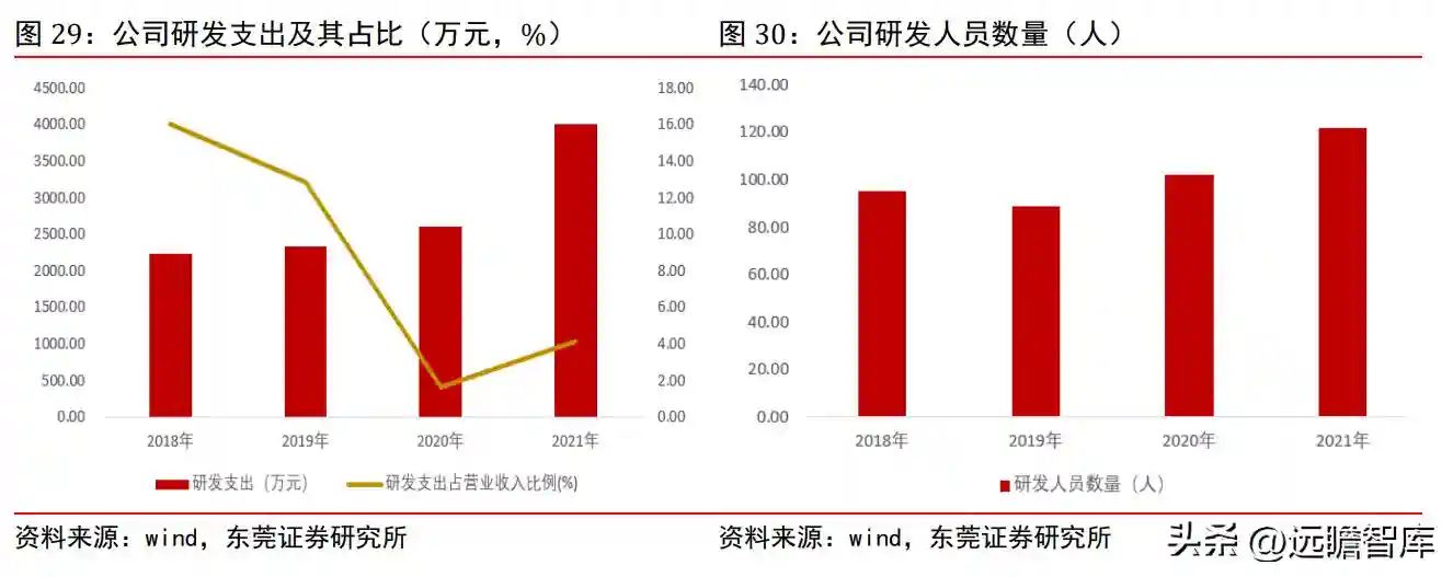 2018-2021年,公司研发支出由2236.65万元增长至4012.93万元,年均复合增速约为21.51%;研发人员数量由95人增长至122人,年均复合增速约为8.7%。