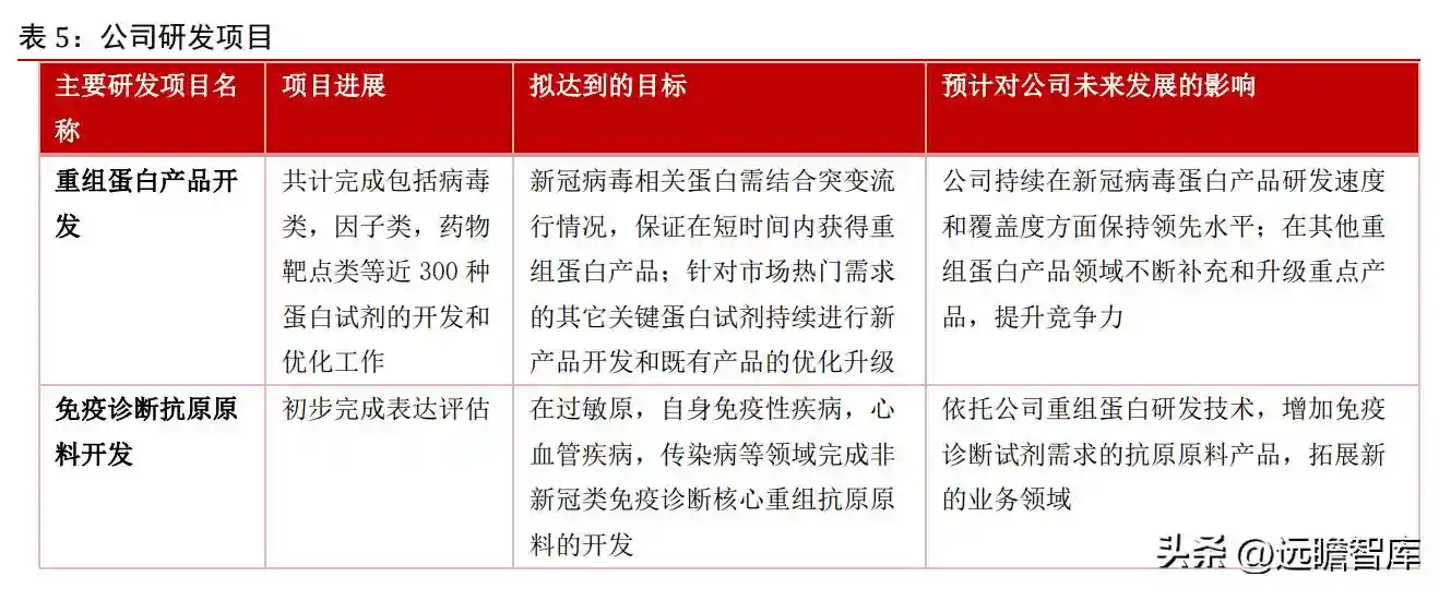 建立相对闭环的研发体系。公司的重组蛋白、抗体、基因和培养基产品均为自主研发,经过多年投入和建设,建立了较强的研发实力,自主研发了规模较大的蛋白和抗体试剂产品库(现货产品)。