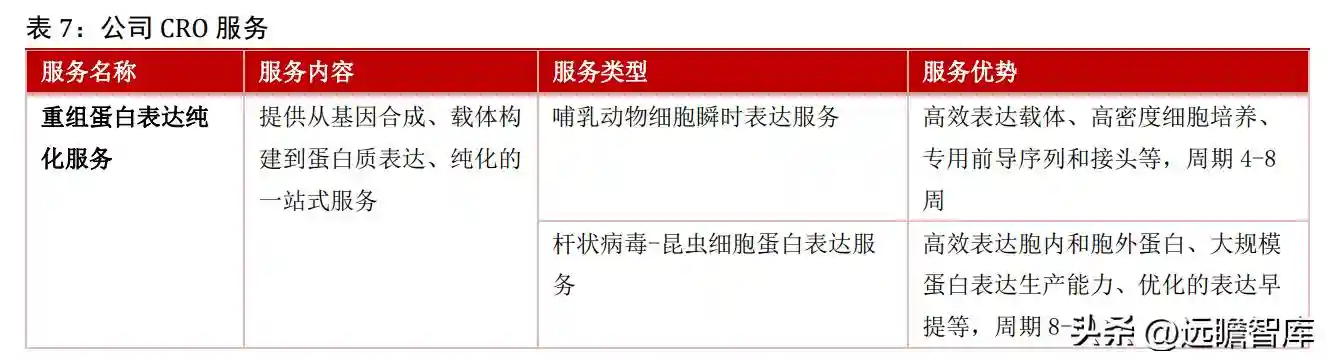 其中重组蛋白表达纯化服务方面,公司拥有多种重组蛋白表达系统,包括昆虫细胞、哺乳动物细胞和原核蛋白表达系统,满足客户不同研究需求;公司能够提供从基因合成、载体构建到蛋白质表达、纯化的一站式服务,可以根据客户需求,选用不同表达/纯化标签、表达宿主等,为客户提供高质量、低成本的重组蛋白。