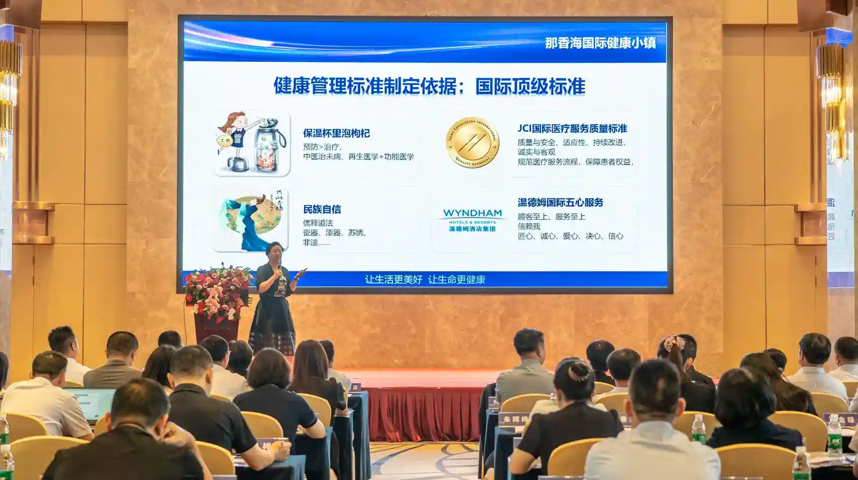 南京华升集团副总经理殷治芬则从健康行业发展趋势、那香海的资源禀赋及核心竞争力三个方面入手,向与会成员介绍了那香海国际健康小镇。她表示,美好生活的前提就是健康,在健康已经成为社会生活刚需的情况下,那香海依赖优质的气候、环境、资源、服务、医疗及配套等资源禀赋,打造全龄共享的高品质健康生活方式,从而引领人们迈向更美好的人生。