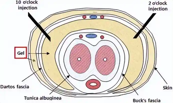 那玻尿酸打在哪里了呢?大部分填充在yin茎浅筋膜和海绵体白膜之间,少部分分布在皮肤和浅筋膜中间。